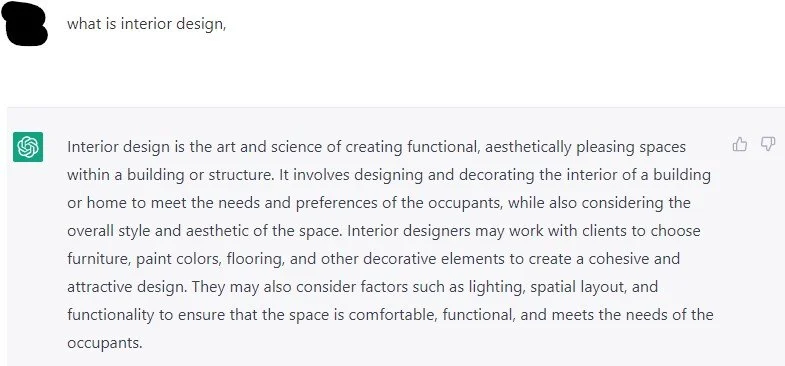 For example, I asked ChatGPT “what is interior design” and below was its generic response