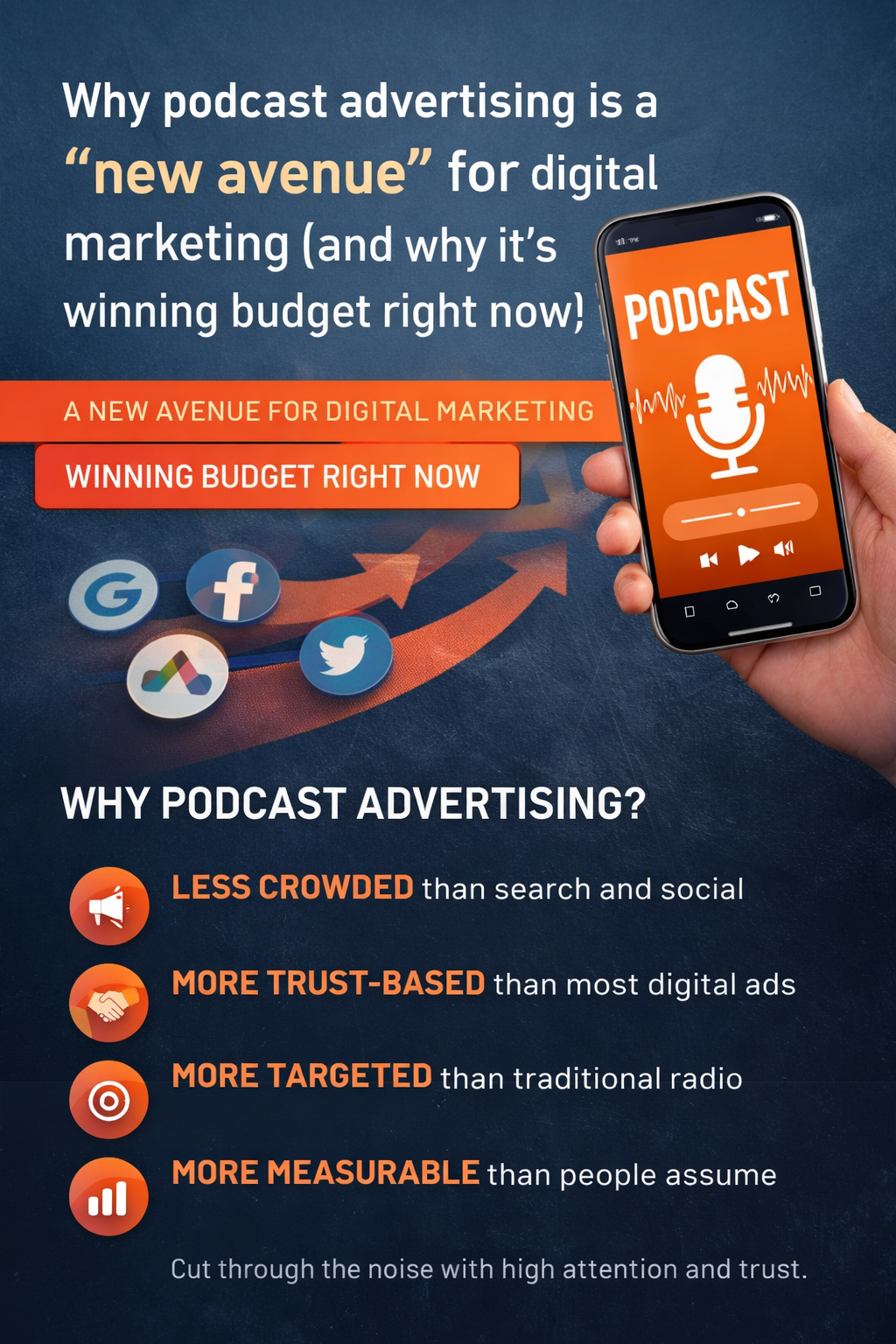 Podcast advertising sits at the intersection of attention, trust, and targeting—three variables that directly influence marketing performance. Unlike crowded search and social platforms where users are distracted and skimming, podcasts deliver your message in an environment where audiences are intentionally listening. That difference alone changes how your brand is received.