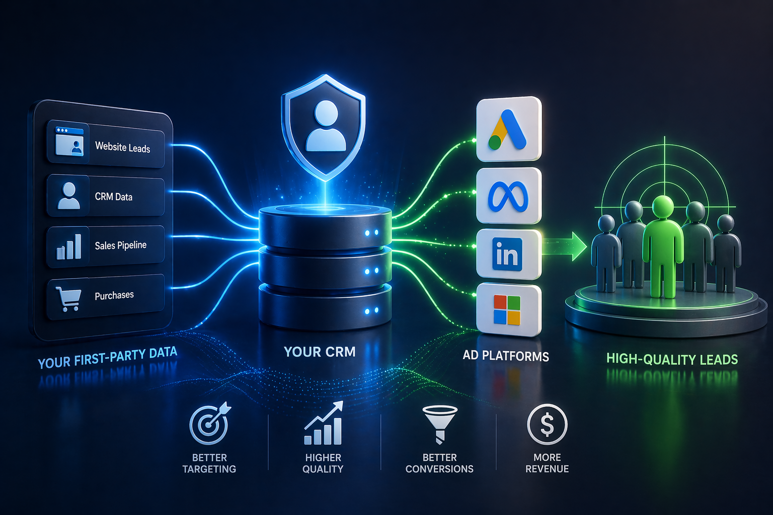First-party data is information collected directly from your business, such as customer lists, leads, and CRM data. This data is highly valuable because it allows ad platforms to optimize targeting based on real customer behavior rather than assumptions.
